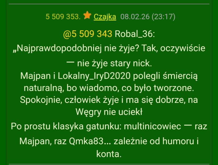 | debiut | 2024-03-23 | ostatnia aktywność --- ostatnio na czacie | 2026-02-25 20:39 --- 2026-02-25 08:43 | |||||||