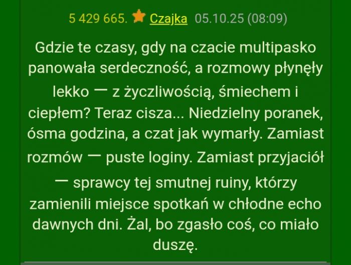 debiut | 2024-03-23 | ostatnia aktywność --- ostatnio na czacie | 2025-10-05 08:14 --- 2025-10-05 08:15 | ||||||||||||||||