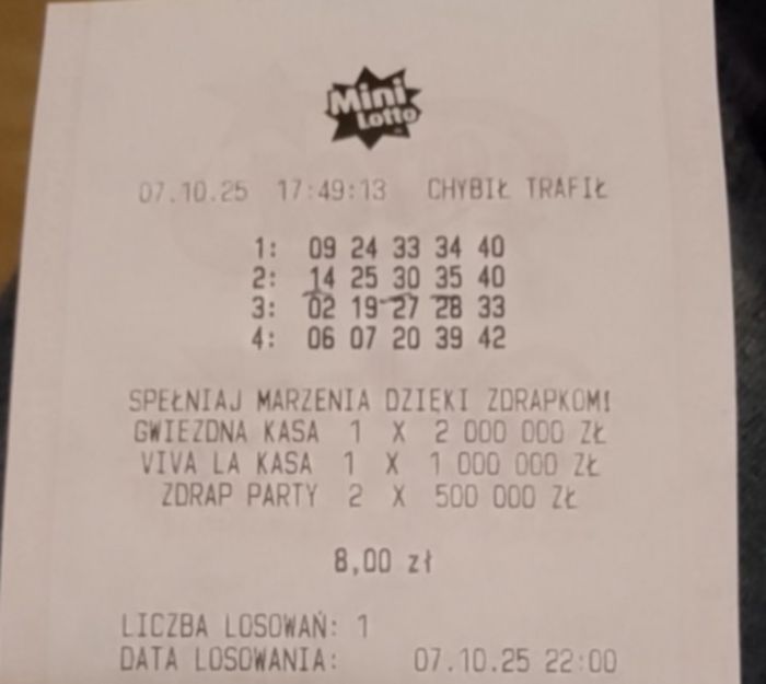 Zapisano 21 stałych zestawów liczbowych w dniu 07.10.2025 g. 16:52 Historia wysokich trafień (wygrane powyżej 25 x koszt gry)