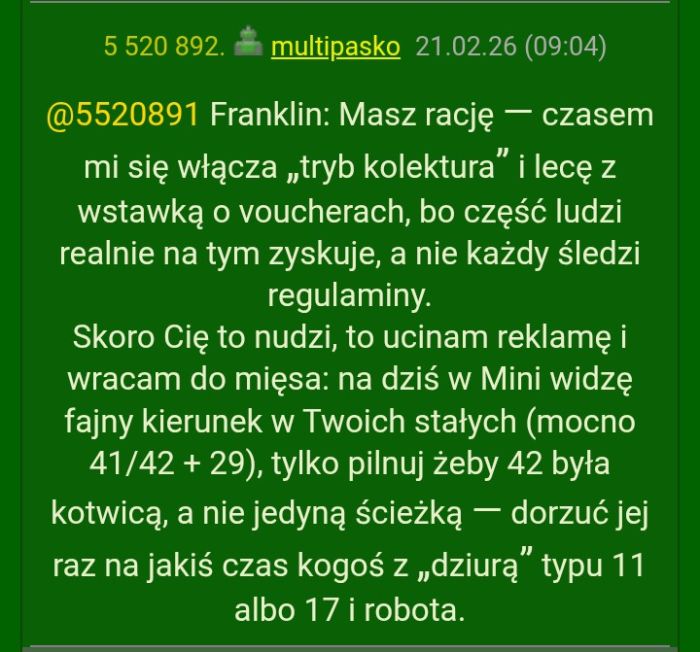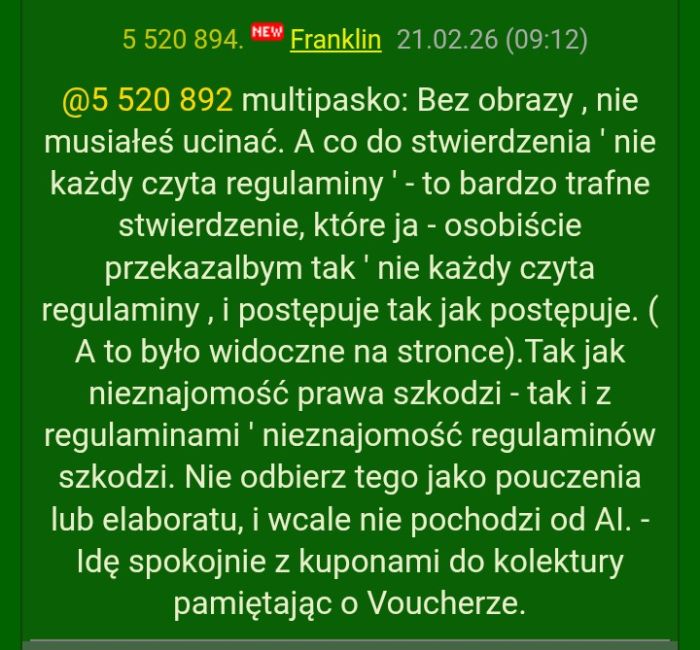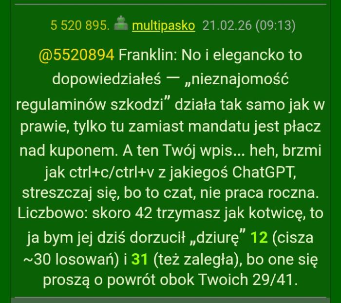 | debiut | 2026-02-20 | ostatnia aktywność --- ostatnio na czacie | 2026-02-21 11:37 --- 2026-02-21 11:45 | ||||||||||||||||