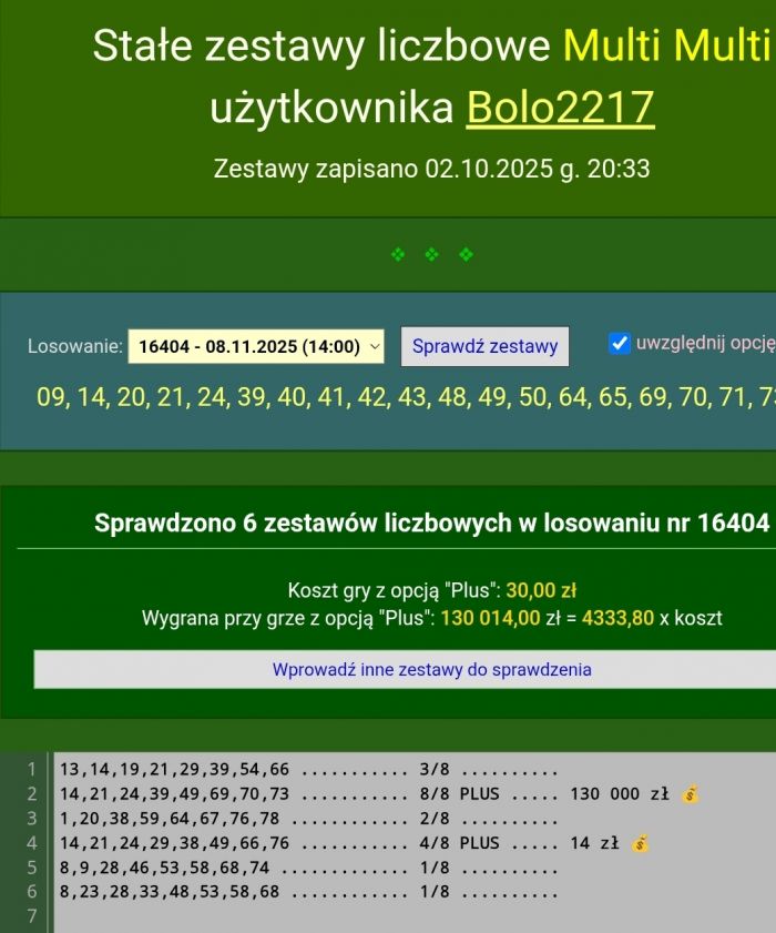 | Zapisano 1 stałych zestawów liczbowych w dniu 22.09.2024 g. 20:36 Historia wysokich trafień (wygrane powyżej 25 x koszt gry)